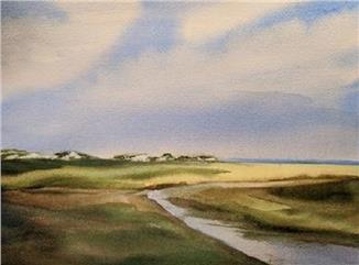 This scene depicts a marsh and distant sand dunes in Sandwich, Massachusetts. The original painted is single matted. Fits a standard 11x14" frame.
